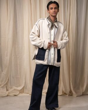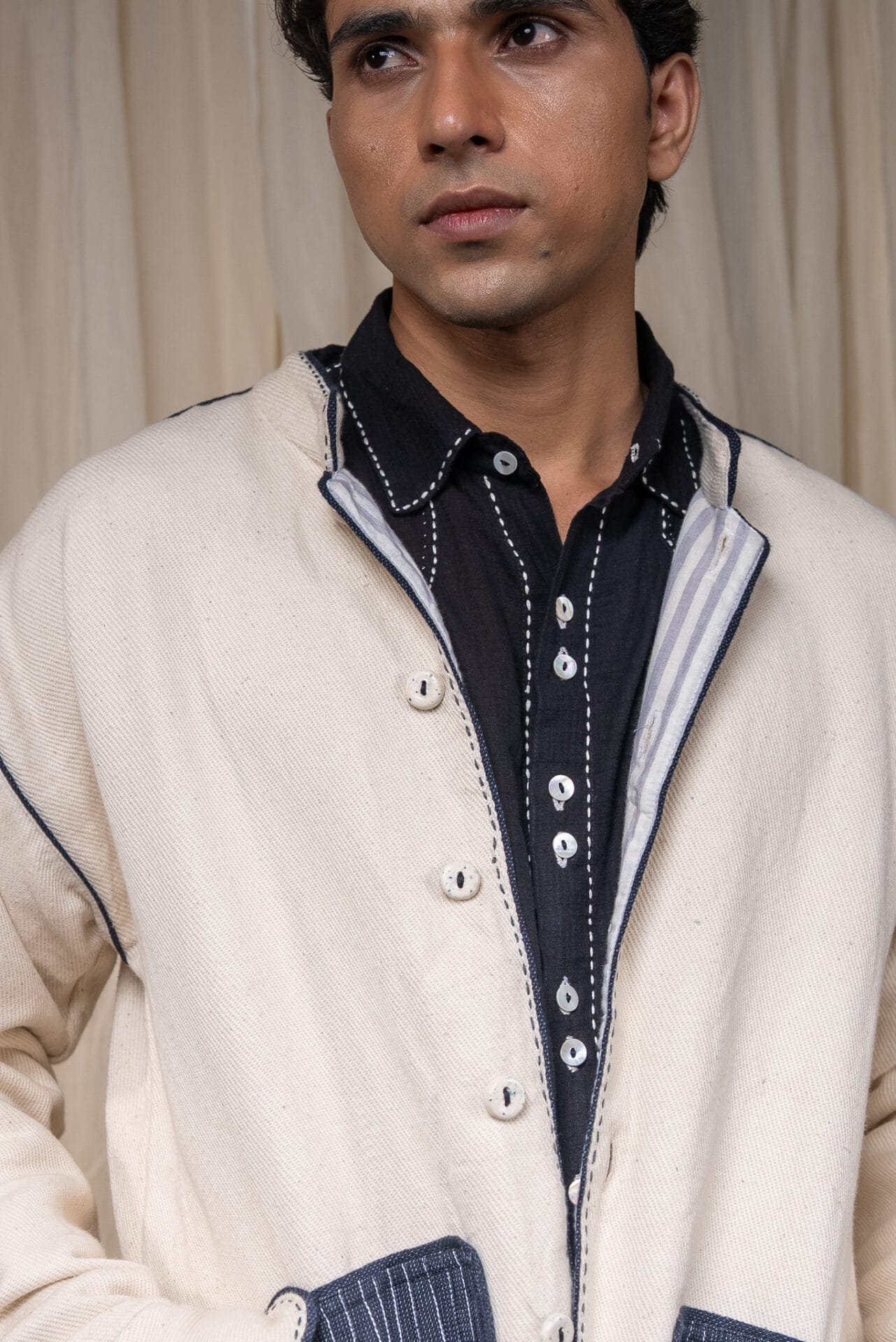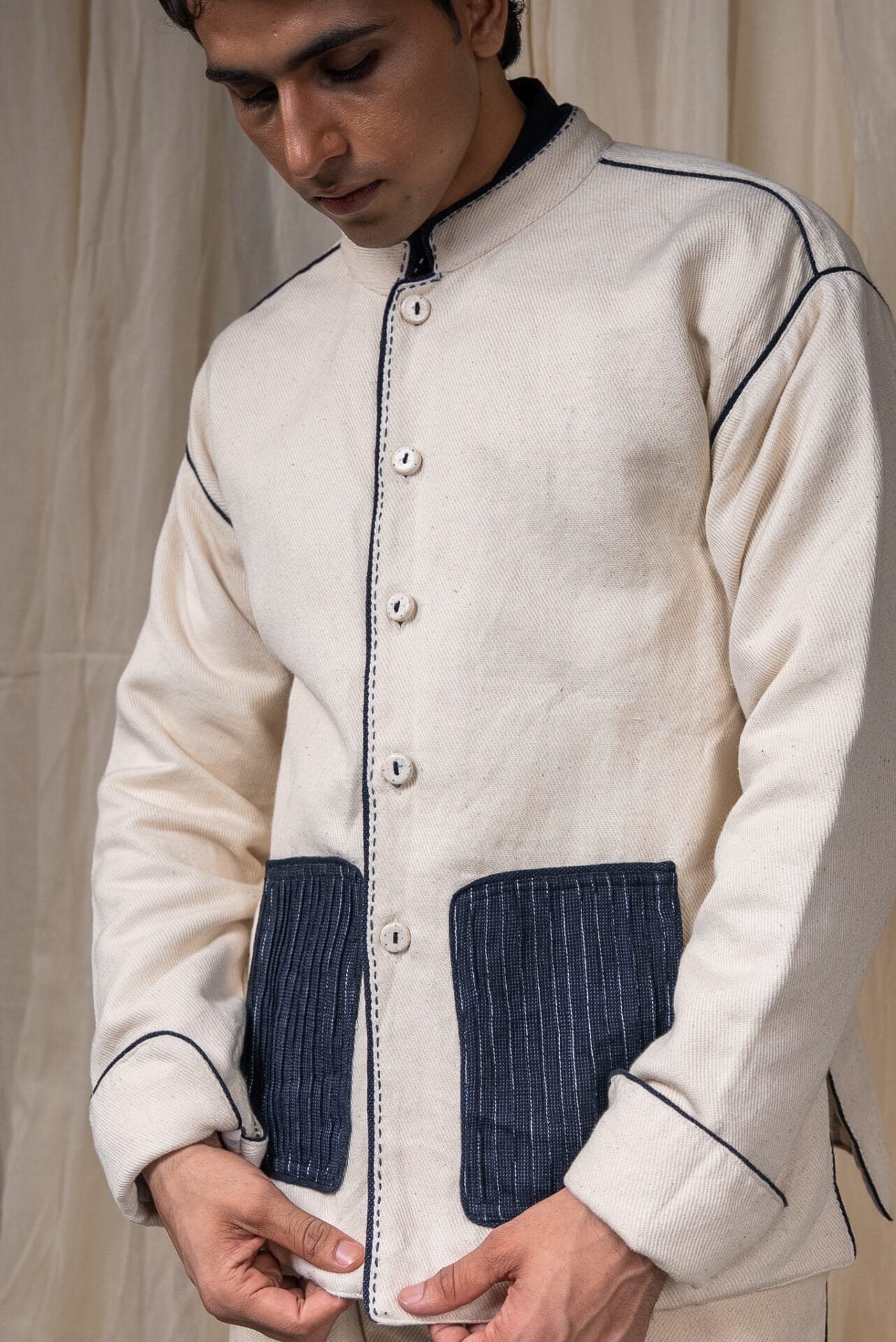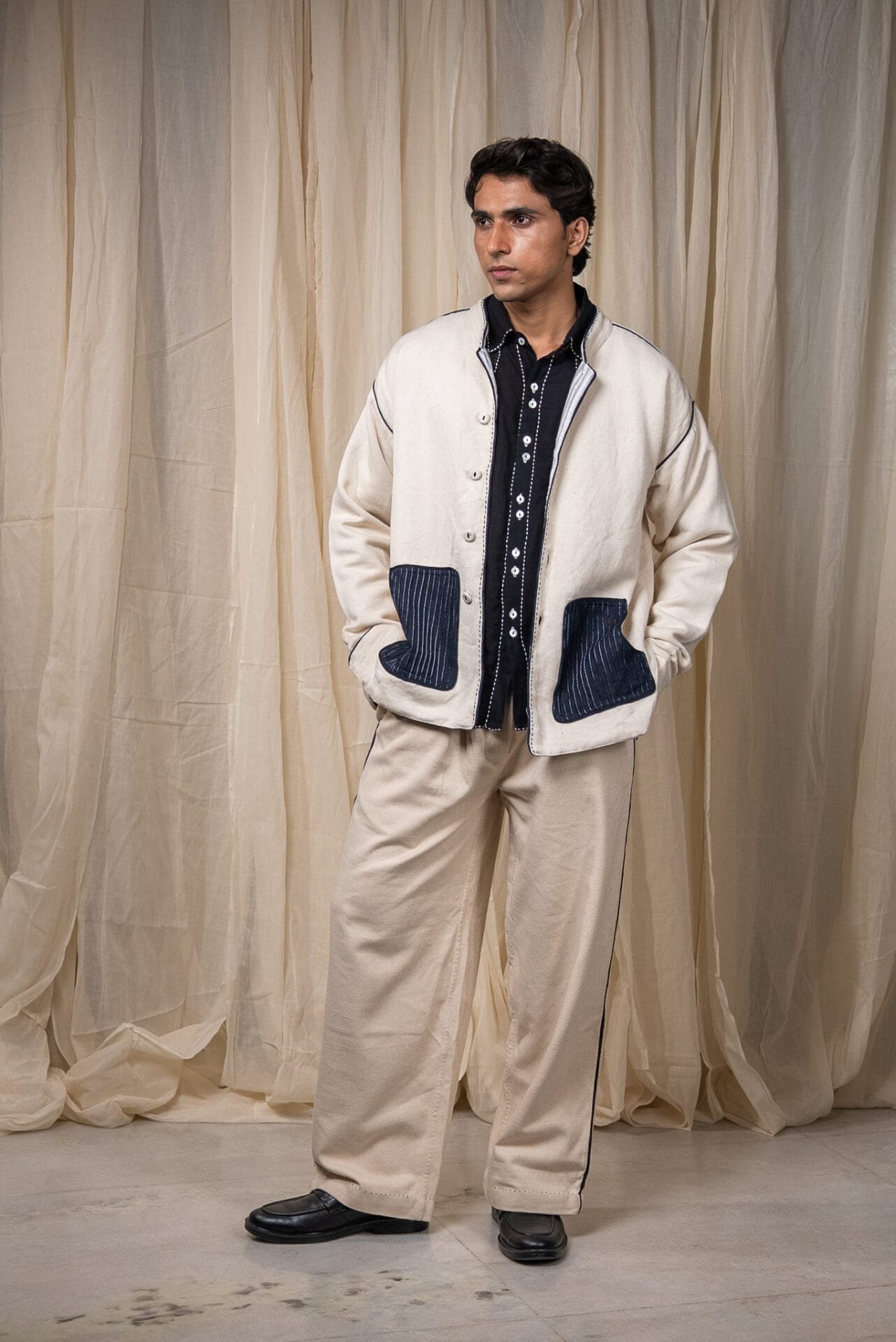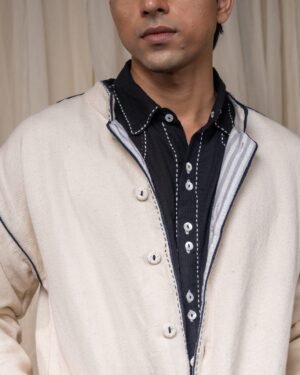 The silhouette features a Mandarin collar, side slits for ease, and broad cuffs finished with handwoven grey stripes and Midnight Black piping. Pockets in handwoven Midnight Black cotton are pintucked for subtle structure and contrast. Ceramic buttons complete the piece — adding a textural detail.