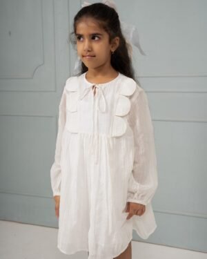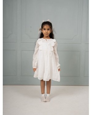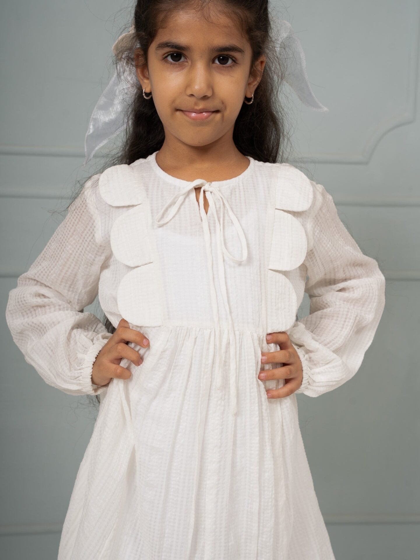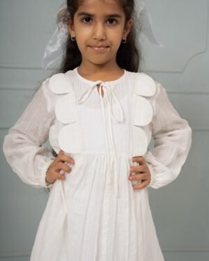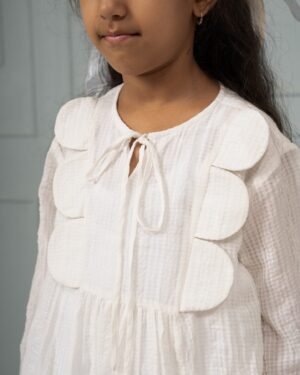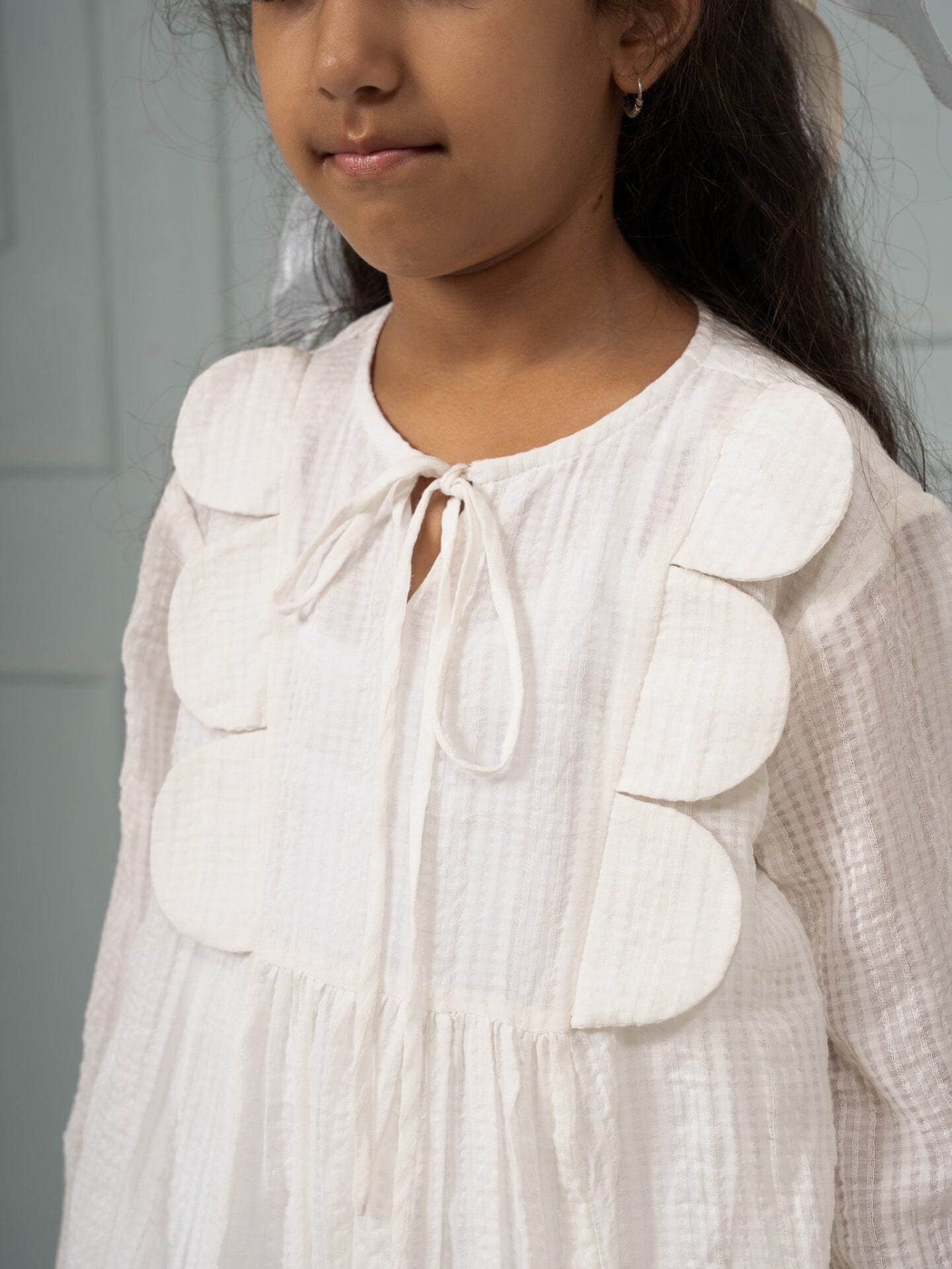 A scalloped yoke, checked banana fiber fabric, and a creamy palette come together in this sweet dress. It feels like hom