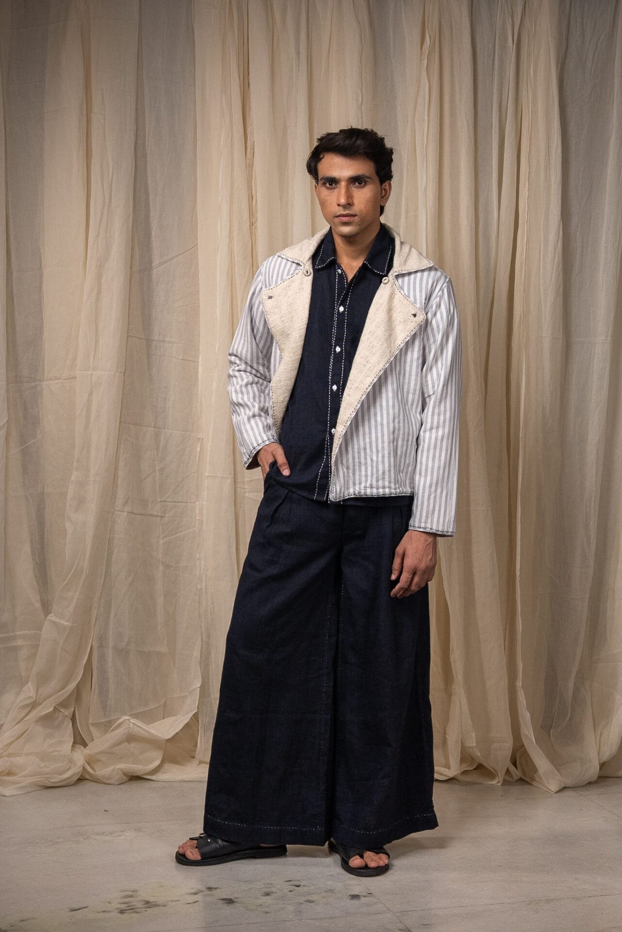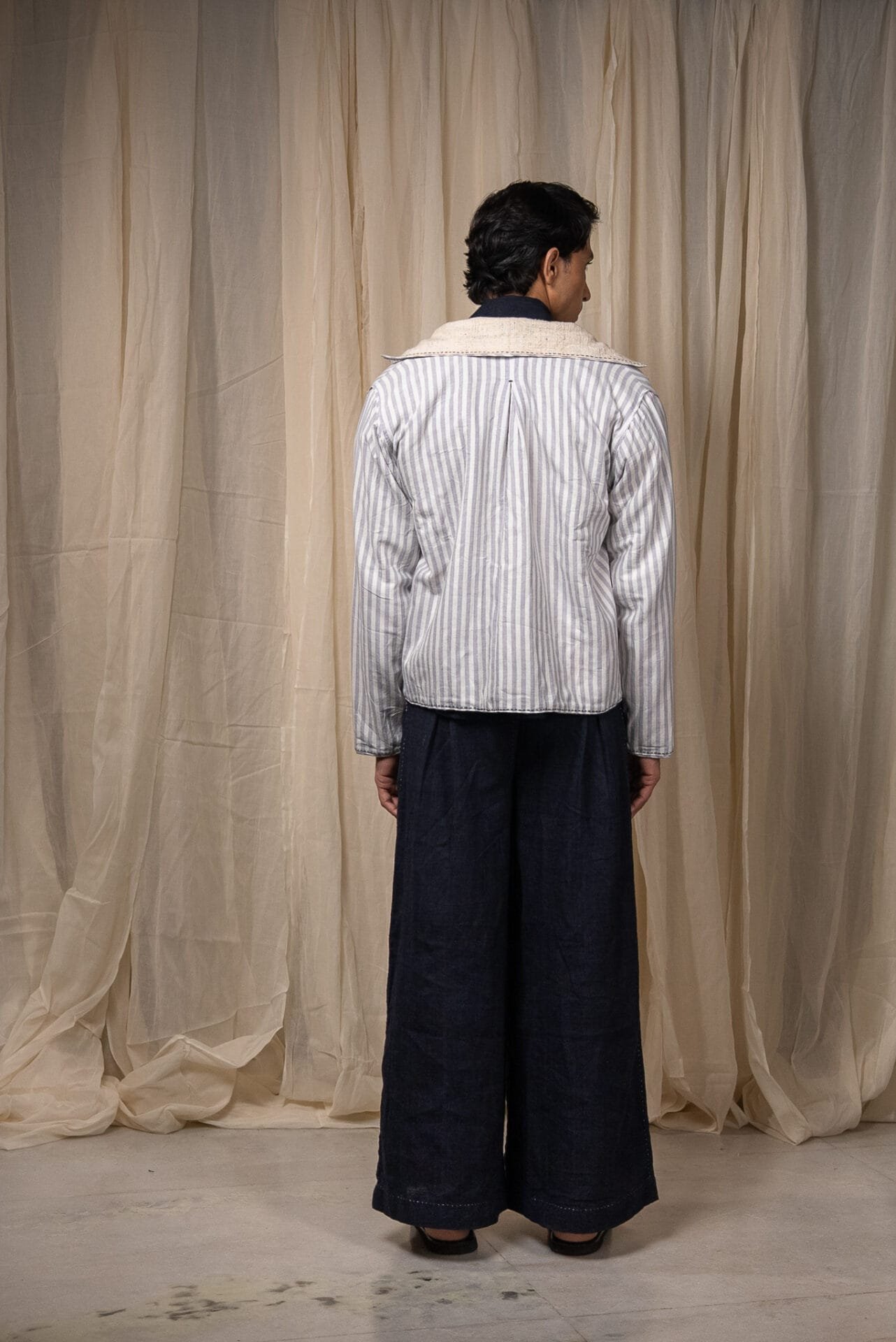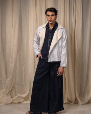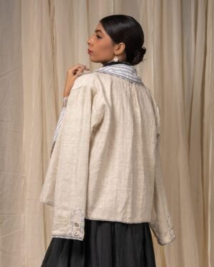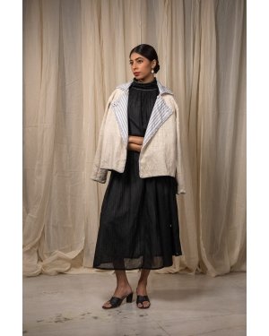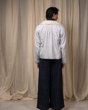 Made from 100% cotton fibres and natural materials, the In-Out Reversible Cropped Jacket brings together two handwoven fabrics - undyed and unbleached zero-count cotton on one side and grey striped cotton on the other. The surface is detailed with minimal hand-done Kantha embroidery, creating quiet linear texture across the fabric.