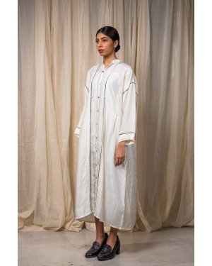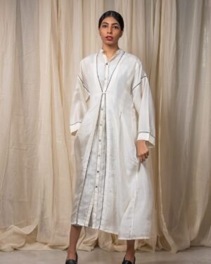Broad cuffs finish the sleeves, and Midnight Black Chanderi piping traces the seams, adding contrast to the fluid structure.