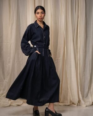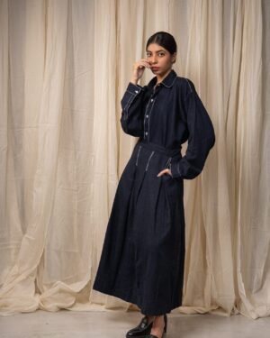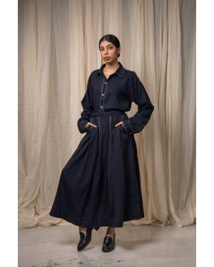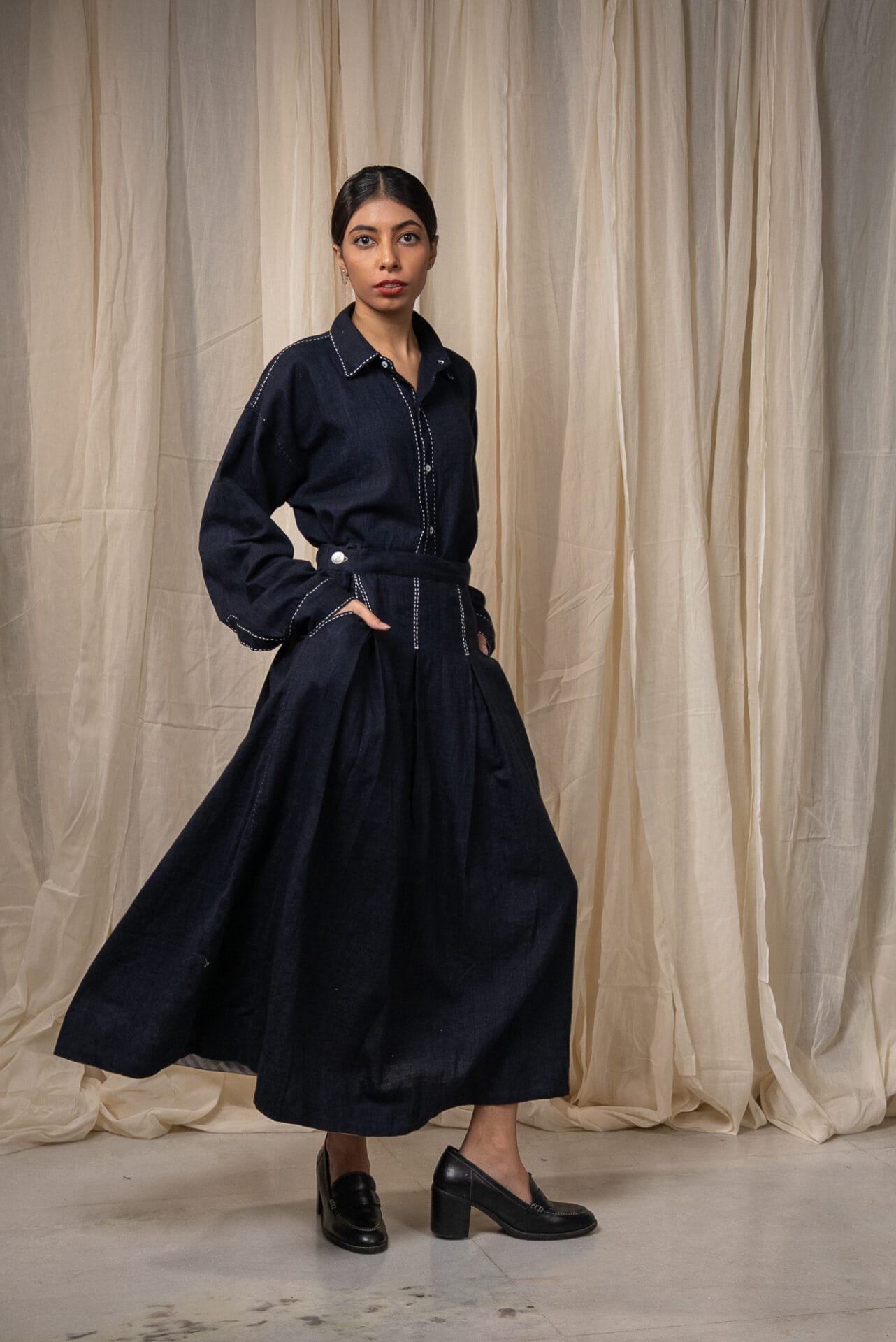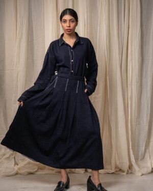 Crafted from 100% cotton fibres and natural materials, this pleated skirt is made from azo-free dyed black handwoven cotton. Featuring simple inverted pleats that fall into a soft A-line silhouette, the skirt carries quiet marks of hand and process through delicate Kantha stitches tracing each fold.