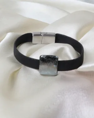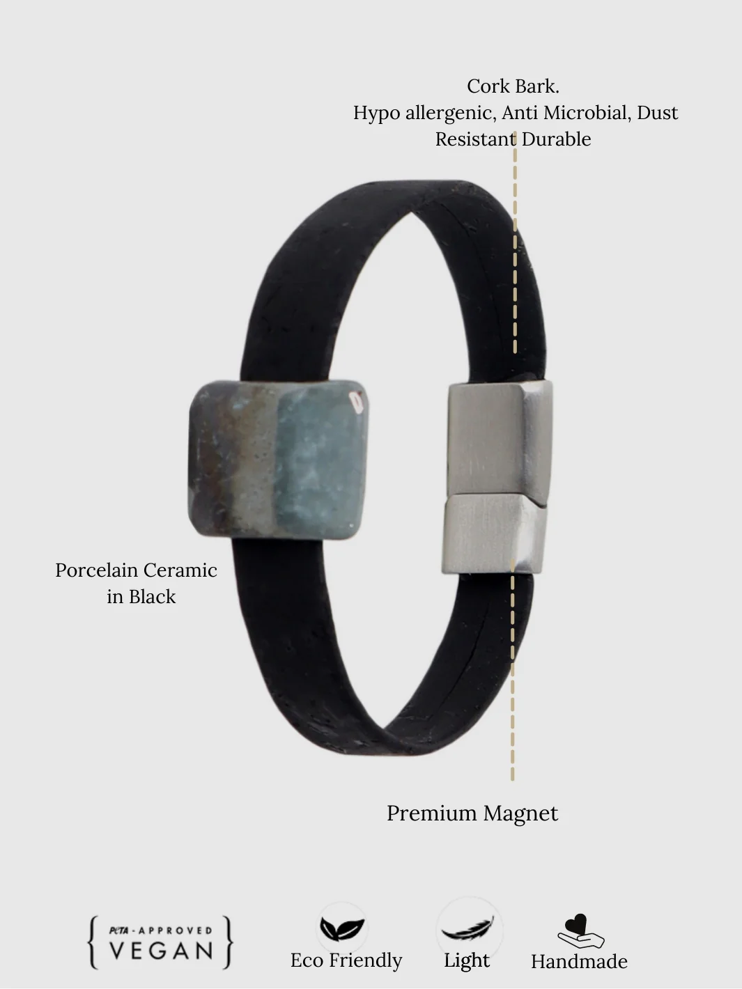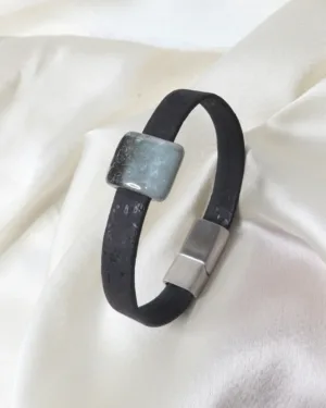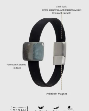 Our Porcelain Ceramic Stone in black and the luxurious Black Cork, come together to create a sophisticated accessory. The coolness of the stone and the smoothness of the cork bark create a unique textural symphony. Inspired by the cooling of the molten lava, this bracelet is versatile and can be paired with your smart casuals or chic suits.