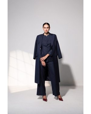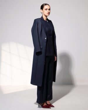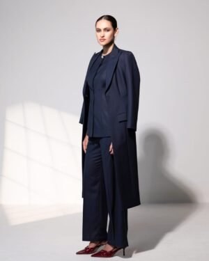 Sculpted yet fluid, the Seraphina Ensemble is a masterclass in modern elegance. The calf-length blazer, cinched with a satin belt, drapes with quiet authority, while the round-neck top with a surplice back cutout introduces an unexpected, alluring twist. Tailored trousers ground the look with sleek precision, creating a silhouette that feels effortless in motion and commanding in stillness. Perfect for powerful office moments, elevated luncheons, or sophisticated evening gatherings, the set embodies contemporary luxury where strength, grace, and quiet confidence converge seamlessly.