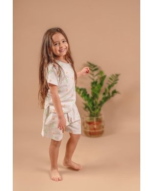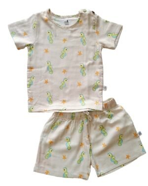 100% organic muslin cottonMatching set of tshirt and shortLightweight and extremely soft, perfect for summerCute Neutral PrintsPoppers at the side help with easy pull up over the head.Drawstring pants for comfort wear