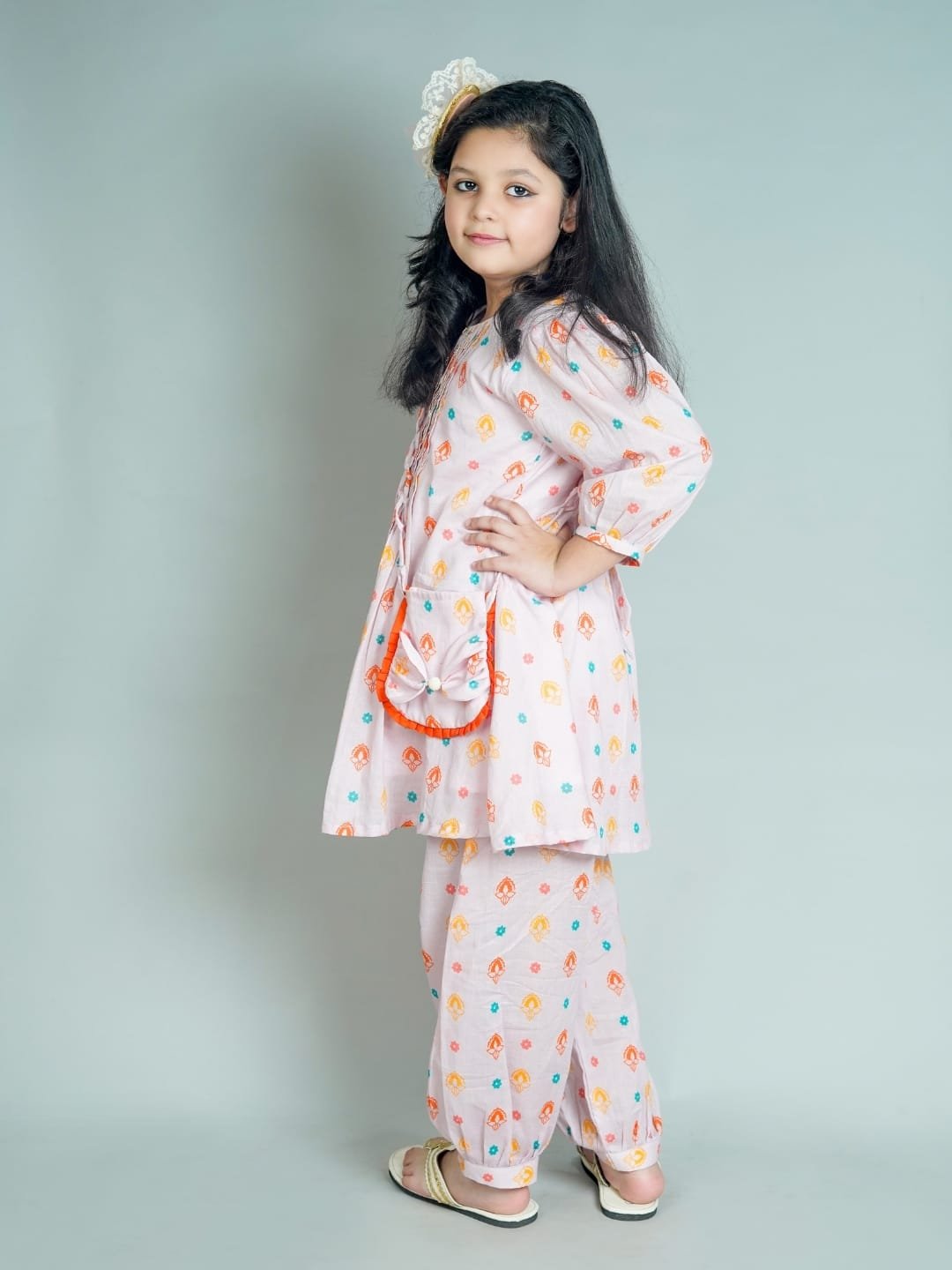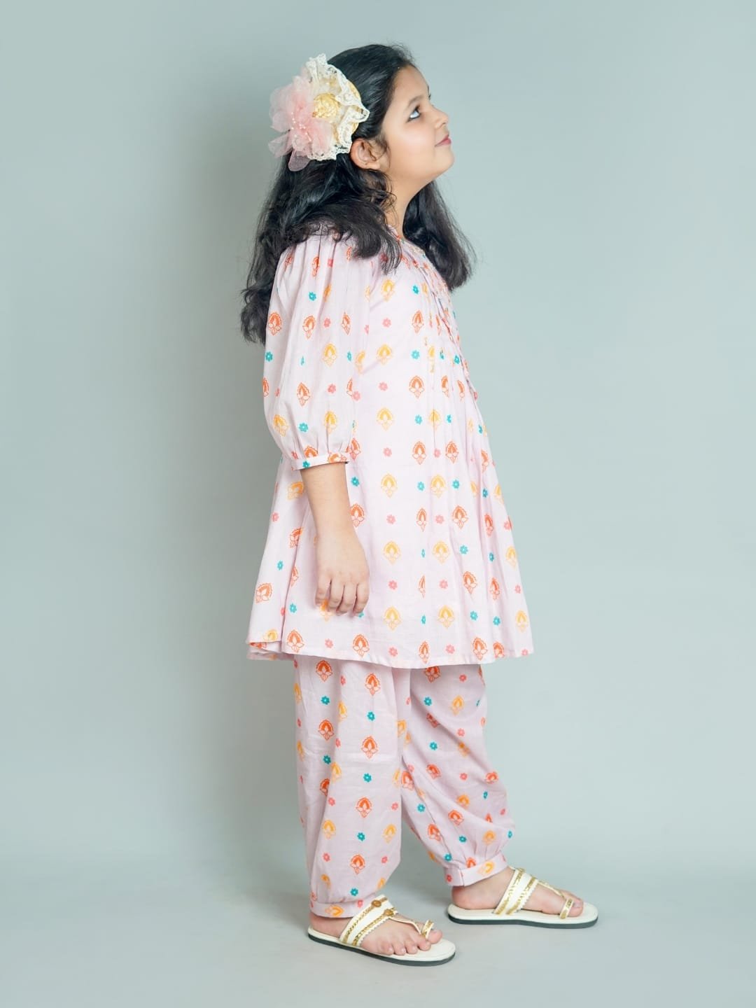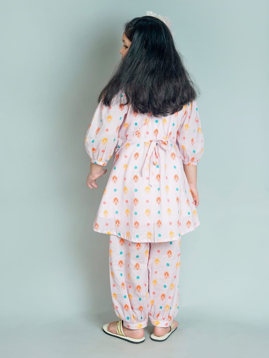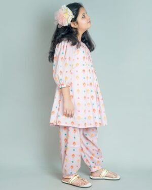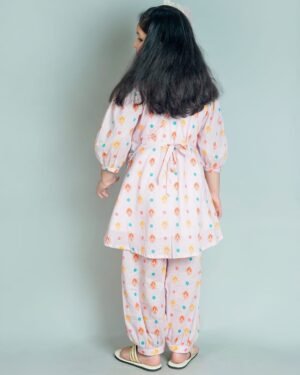 A cute and comfy outfit for your little star! This pastel pink mul cotton kurta set comes with a matching salwar pant an