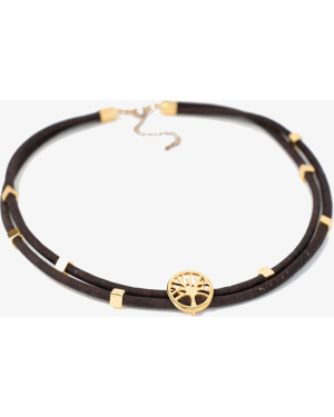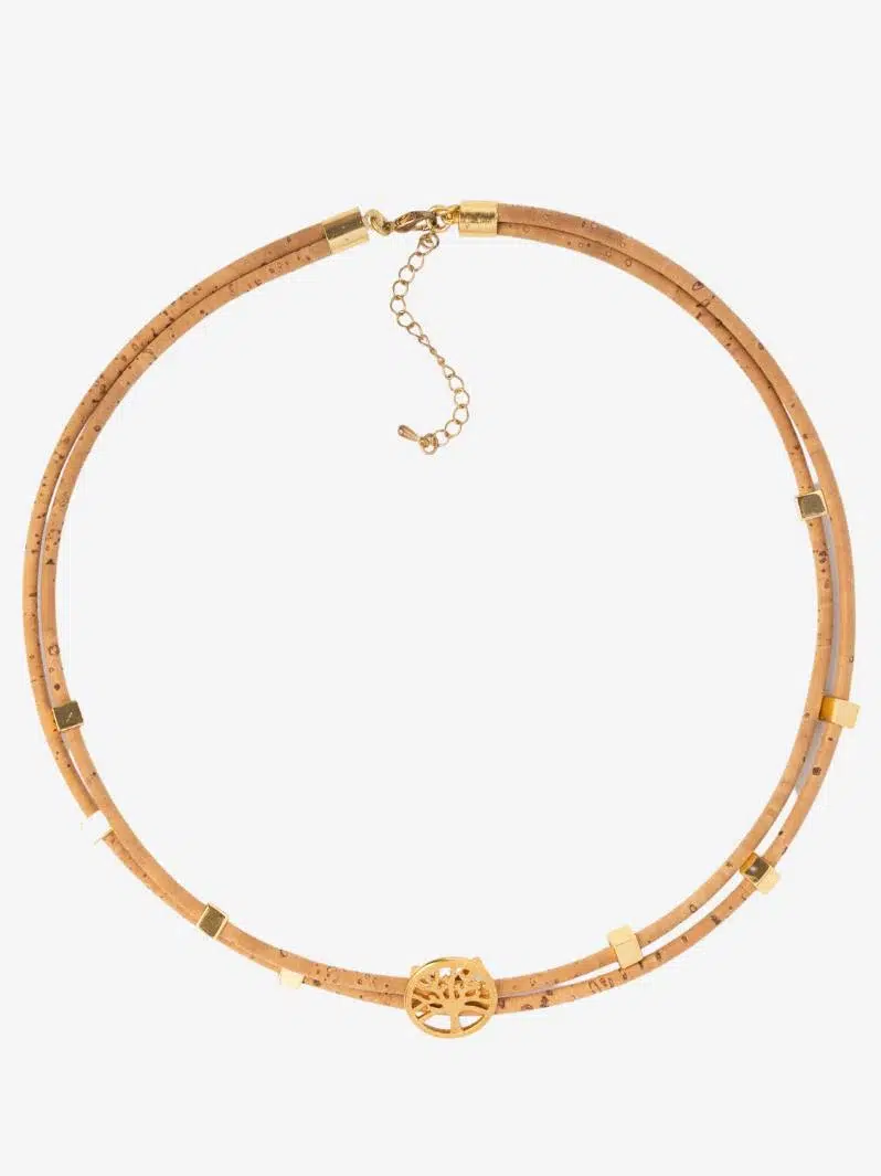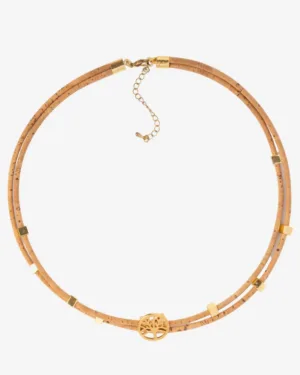 The Tree of Life is an ancient symbol of harmony, balance, and unity. This symbol is rendered in a gold-toned motif that contrasts with an exquisite Vegan Cork choker necklace.