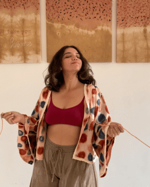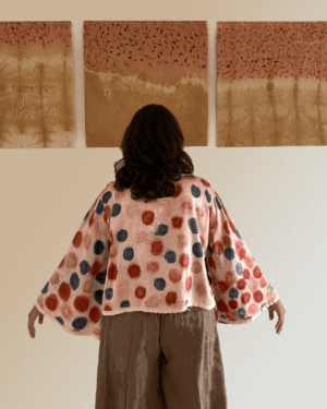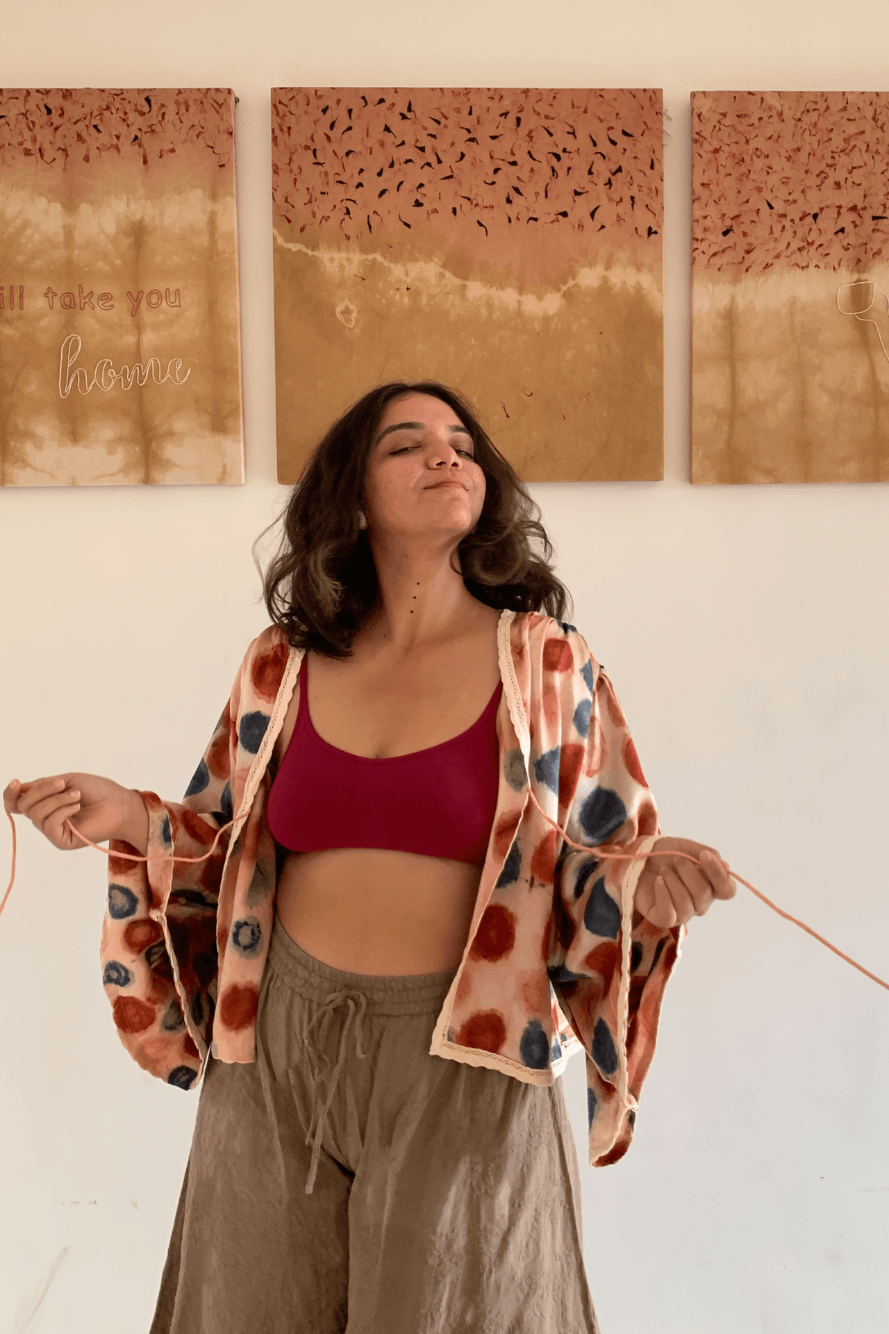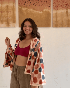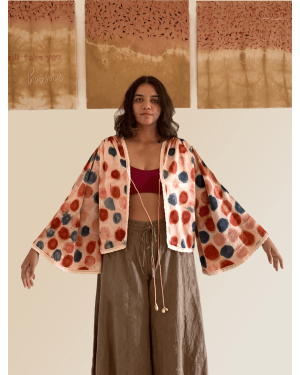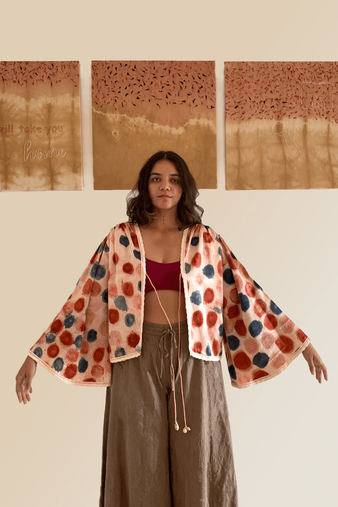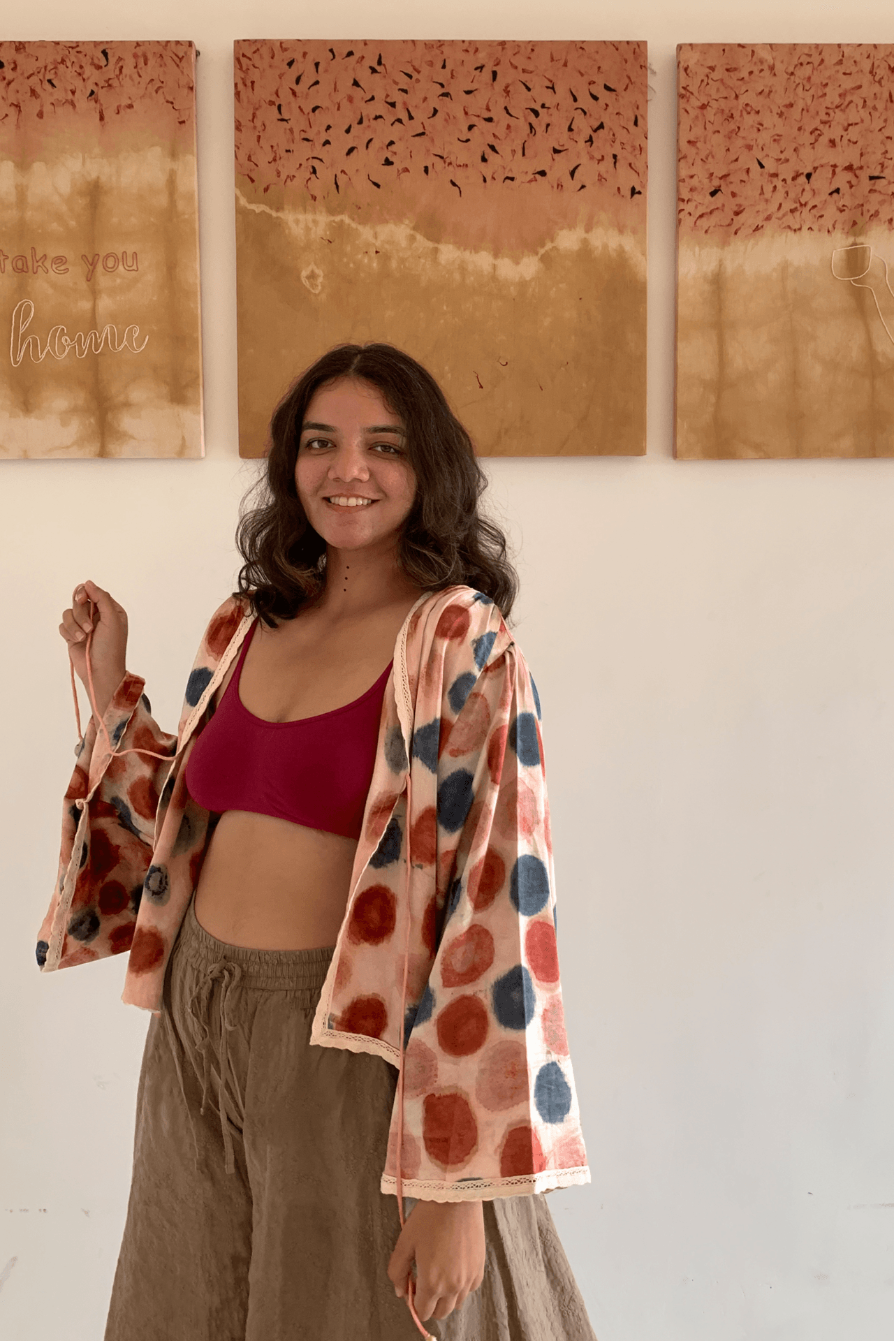 Bageeya's "Tumm tumm" elevates your style with our Handwoven Mashru tie-up featuring bell sleeves, a fusion of tradition and trend. Sourced from Patan weavers, dyed with sacred temple flowers, and adorned with polka dots, this piece is a testament to artisanal excellence, making a chic and conscious fashion statement. Immerse yourself in the allure of tradition and sustainability with our Mashru tie-up. Sourced from the skilled weavers of Patan, Gujarat, the fabric undergoes a transformation with polka dots dyed using Indigo and Manjishta. Our trained artisans, inspired by sacred temple flowers, meticulously craft each piece, creating a unique blend of style and eco-consciousness. This not only ensures a vibrant and lasting color palette but also contributes to the reduction of marine pollution. Embrace the playful charm of our Handwoven Mashru tie-up. Gethers on the shoulder create a distinctive look, while puffy shoulders and bell sleeves add a touch of whimsy.