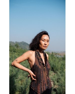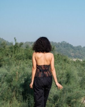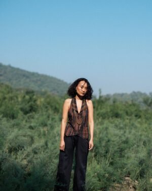This vest is designed from upcycled fabric, made using post production waste and can elevate any look.It can be worn as is or over a shirt.It pairs perfectly with our flared pants.It can be dressed up or down for each occasion.