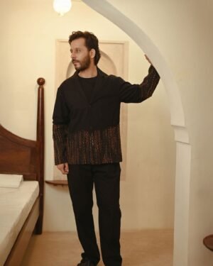 The garment is made from hand woven upcycled fabric and so the color might vary slightly for each batch.