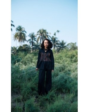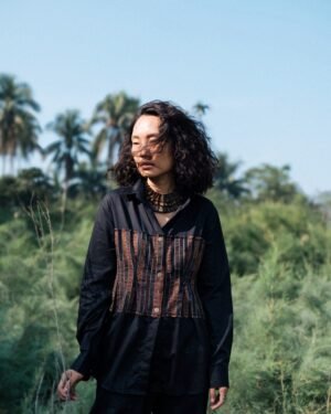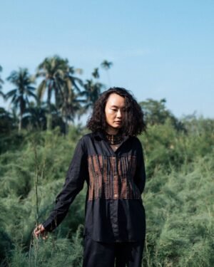 The garment is made from hand woven upcycled fabric and so the color might vary slightly for each batch.
