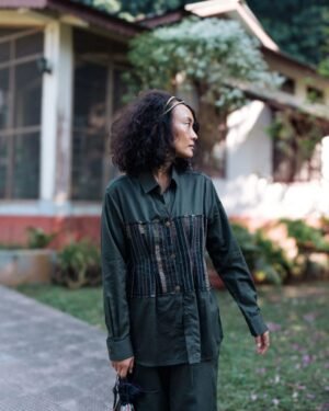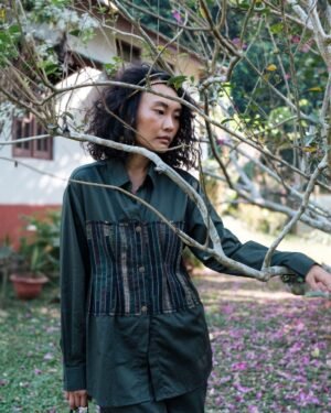 The garment is made from hand woven upcycled fabric and so the color might vary slightly for each batch.