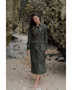 A truly exquisite wrap shirt midi dress that seamlessly transforms from a sophisticated staple to a casually chic garment designed from upcycled fabric, made using post production waste.