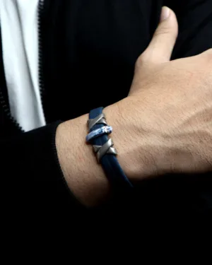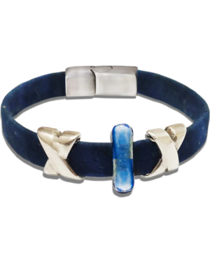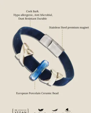 Handmade in luxurious cork and Antique Silver is our exclusive bracelet that symbolizes the crosswinds in the Artic.. The Prussian Blue Cork and antique silver create a look that is well suited for any occasion. The bracelet is enclosed in a premium magnetic clasp making it a must-have jewellery for your daily or party ensemble.