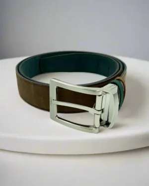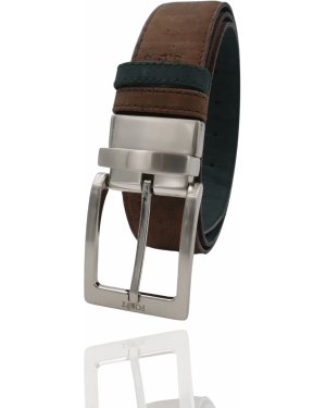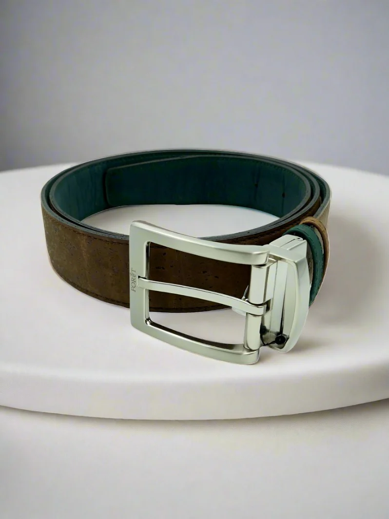 Introducing Verdant Earth Reversible Vegan Cork Belt by FOReT. Featuring rich green on one side and earthy brown on the other, this versatile accessory is handcrafted for style and sustainability. This belt is not only stylish, but it's also environmentally friendly. Made from vegan cork, it's a sustainable alternative to traditional men's leather belts.