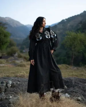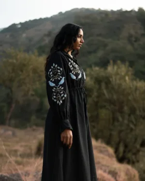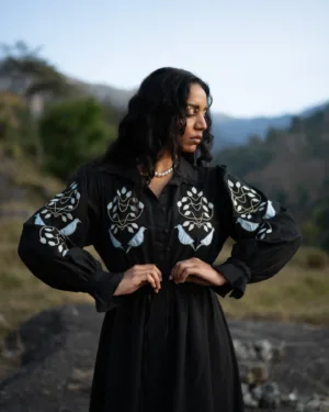 Designed with a classic shirt collar and a soft, flowing silhouette, this dress is adorned with appliqué hand embroidery that adds texture and artistry to the look. The adjustable drawstring at the waist allows you to clench and shape the fit exactly the way you like—relaxed or defined. Delicate lace detailing at the hem and collar brings a touch of vintage charm, making this piece both timeless and beautifully crafted.