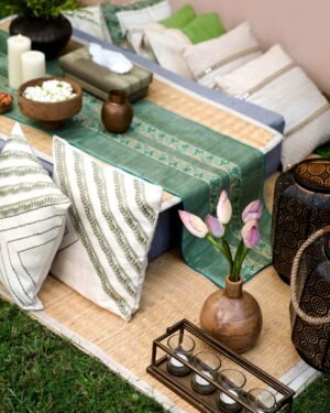 The Viridis handwoven table runner sits gracefully on the dining table, aptly embellishing your overall setup. Handwoven with pure Dupion silk, the Viridis table runner exudes a positive aura and portrays immense artistry with silk piping and beadwork, hand-embroidered on the fabric eloquently.