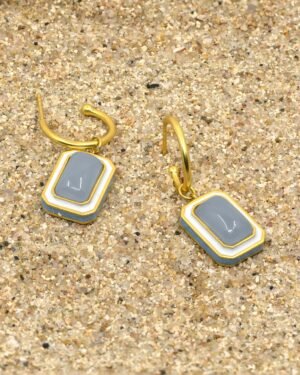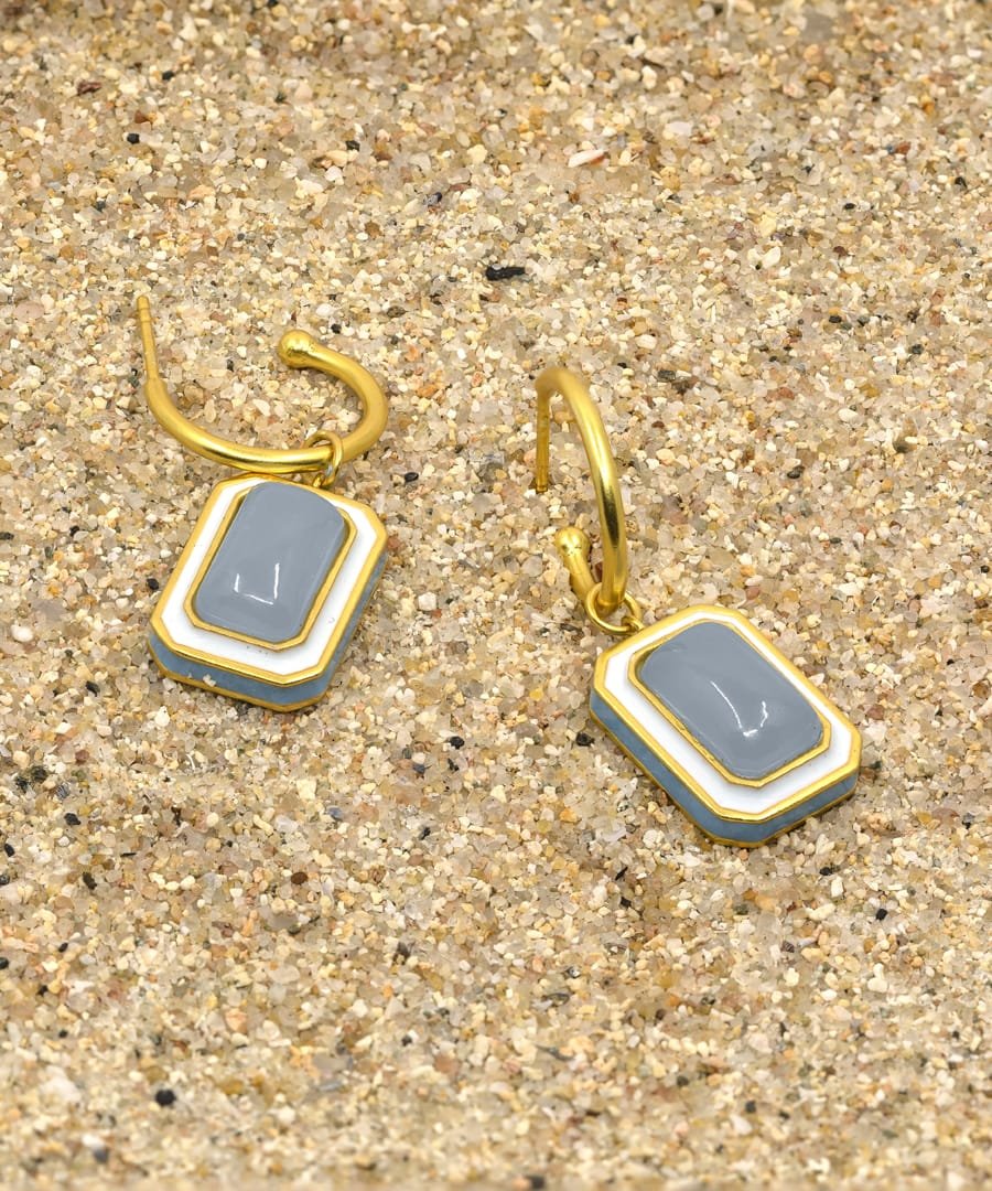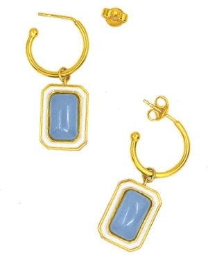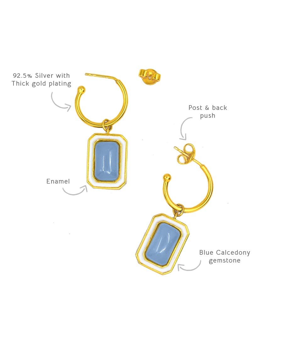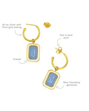 The C-hoop earrings are handcrafted in 92.5% silver,with thick gold plating with enamel details. These earring has a post with push back and has a natural gemstone called blue calcedony, these earrings are super light and easy to wear., Plating: Gold Plated, Metal Type: 92.5% Sterling Silver, Enamel / plating / gemstone: Natural gemstone Blue Calcedony, Lock Mechanism: Post and push back, Measurement cm : 3.2cm , Measurement inches: 1.25 inch, Care Instruction: Keep away from water, perfume and other liquids. Do not use any cleaning agents. Clean when storing in the provided pouches. Store them in moisture free areas and keep them away from water and liquid fragrances.