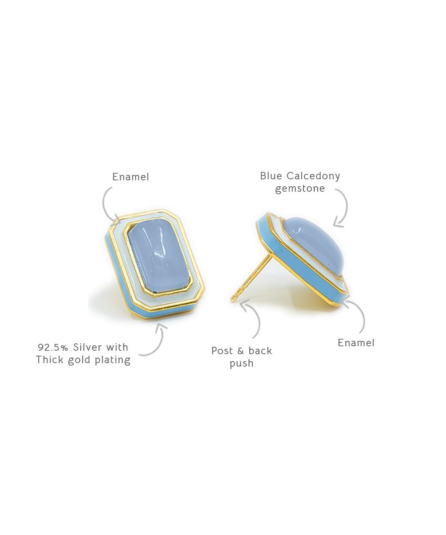 The vitamin sea stud earring has a post with push back, is handcrafted in 92.5% silver, with thick gold plating & enamel details., Plating: Gold Plated, Metal Type: 92.5% Sterling Silver, Enamel / plating / gemstone: Natural gemstone Blue Calcedony, Lock Mechanism: Post and push back, Measurement cm : 1.8 cm x 1.2 cm, Measurement inches: 0.70 x 0.47 inches, Care Instruction: Keep away from water, perfume and other liquids. Do not use any cleaning agents. Clean when storing in the provided pouches. Store them in moisture free areas and keep them away from water and liquid fragrances.
