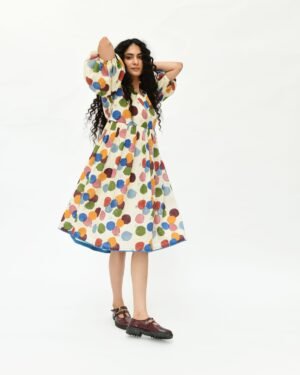 The Void Polka motif is meticulously handcrafted using eight hand-carved wooden blocks and eight rich natural colors, printed on handspun, handwoven fabric sourced from artisan villages in West Bengal. Each piece carries the touch of generations of skilled artisans, reviving age-old techniques through a contemporary lens. Inspired by Vedic tantric art and Songs of Tantra, this design fuses Rajasthani heritage with sustainable fashion, offering a timeless yet refreshing style statement.Design DetailsFabric & Material: 100% organic cotton, handspun & handwovenCraft: Traditional hand block printingLength (dress): 43 inchesDesign Elements: Bell sleeves, both side pocketsModel: 5'8", wearing size SFit: Relaxed silhouette