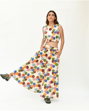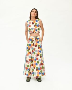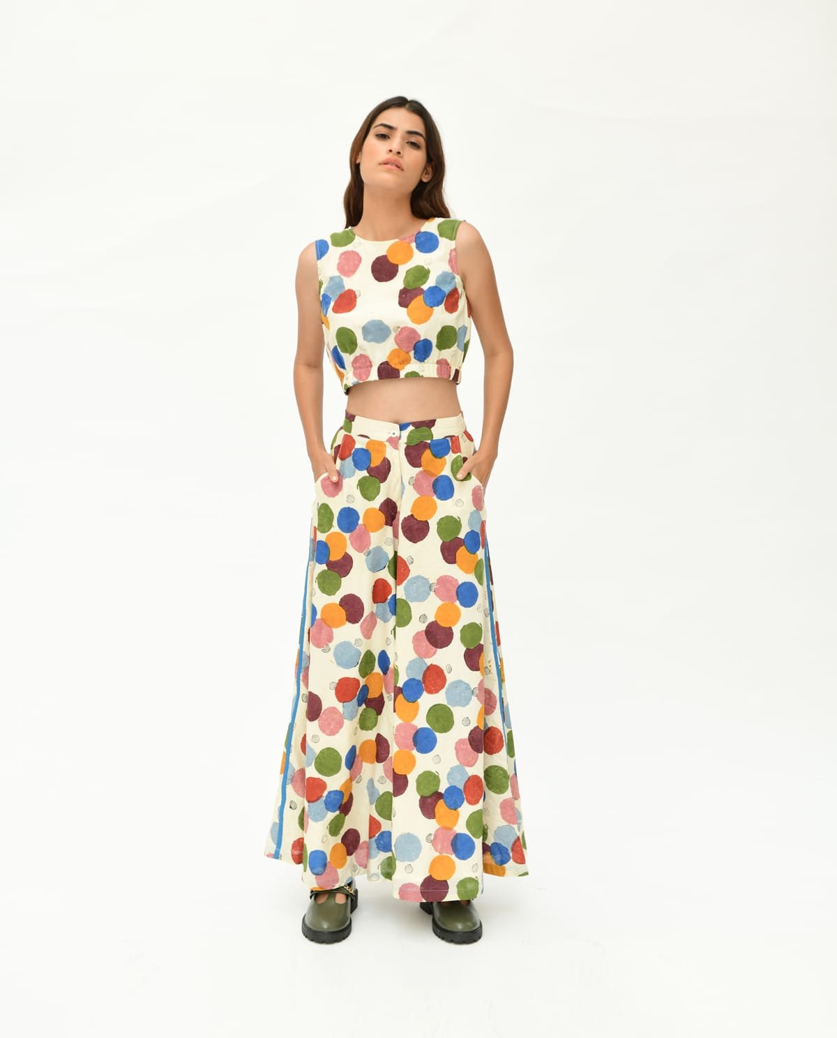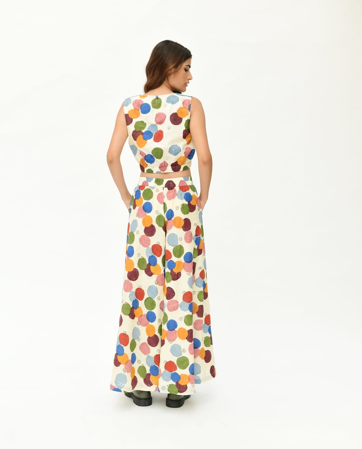 The Void Polka motif is meticulously handcrafted using eight hand-carved wooden blocks and eight rich natural colors, printed on handspun, handwoven fabric sourced from artisan villages in West Bengal. Each piece carries the touch of generations of skilled artisans, reviving age-old techniques through a contemporary lens. Inspired by Vedic tantric art and Songs of Tantra, this design fuses Rajasthani heritage with sustainable fashion, offering a timeless yet refreshing style statement.Design DetailsFabric & Material: 100% organic cotton, handspun & handwovenCraft: Traditional hand block printingLength (top): 16 inchesLength (pant): 39 inchesDesign Elements: Zero necks cropped with bottom elastic for top & Flared ankle length with side piping for pantsModel: 5'8", wearing size SFit: Relaxed silhouette