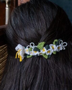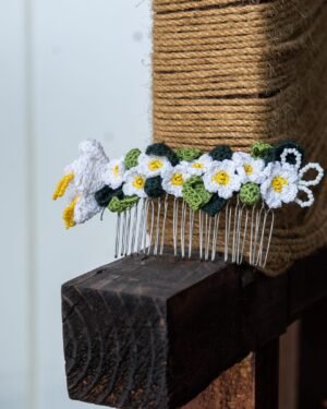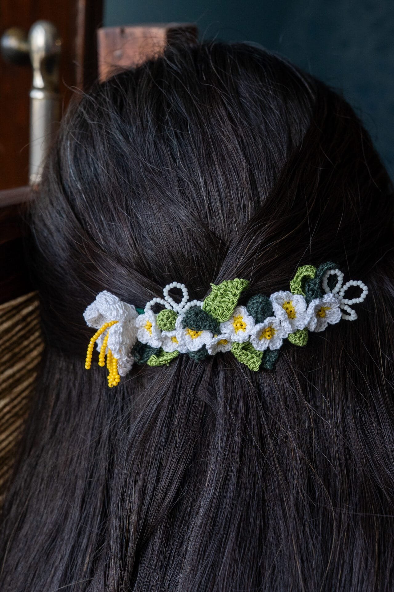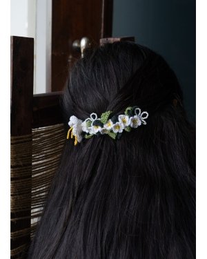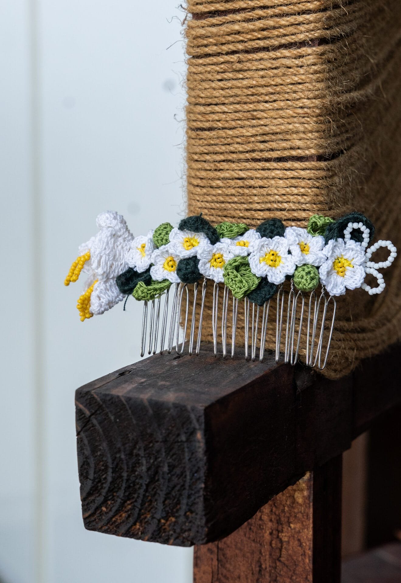 Crochet daisy flowers and leaves,Detailed with white and yellow seed beads