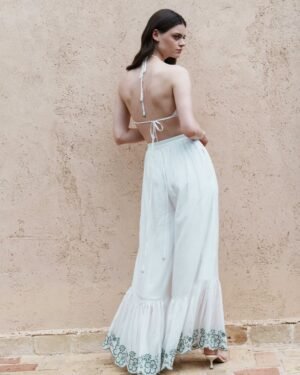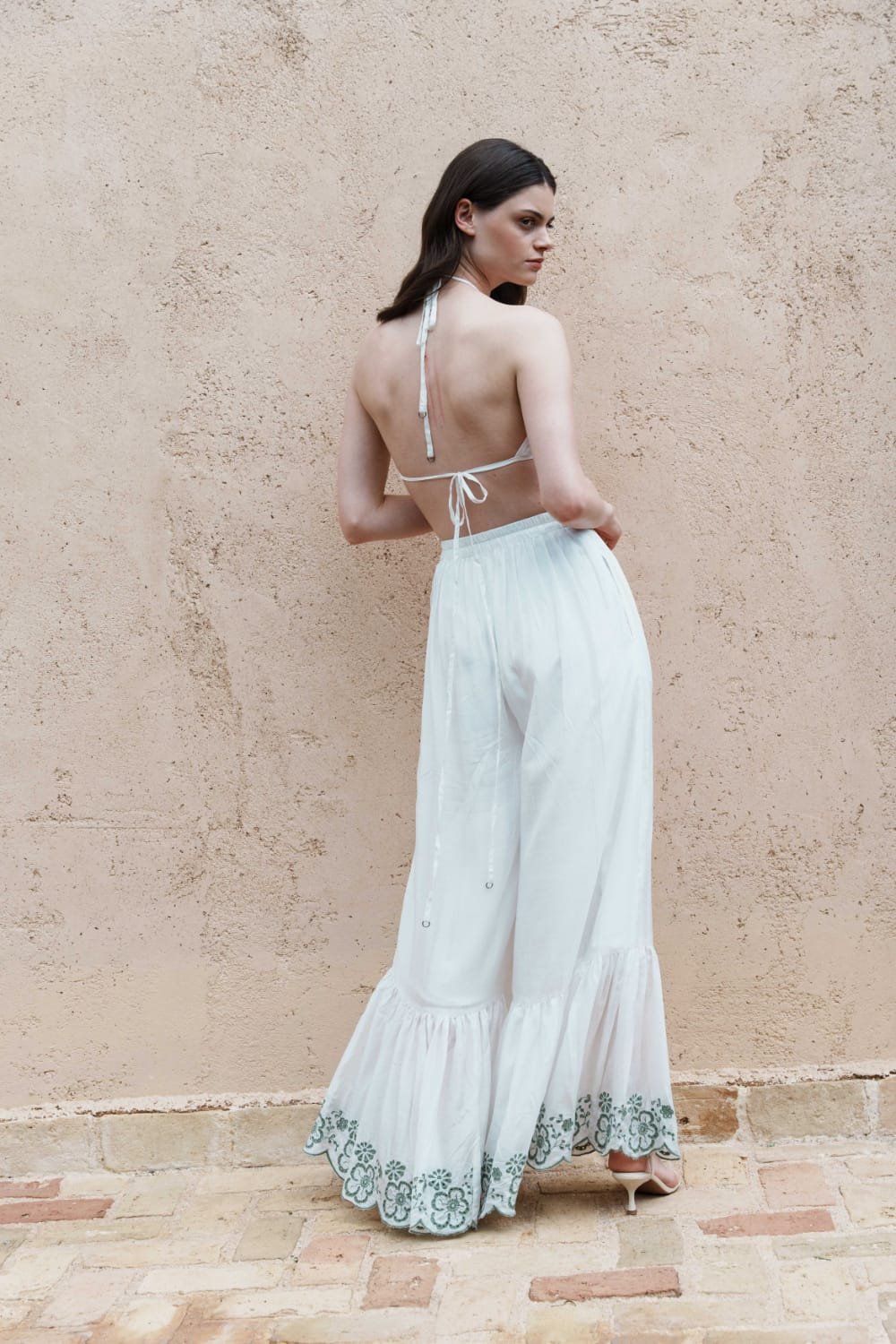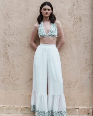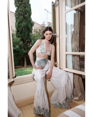 A delicate White mul schfflie top with embroidered schfflie sharar pants adorned with schiffli embroidery ? balancing everyday ease with Pinnacle?s artisanal refinement.