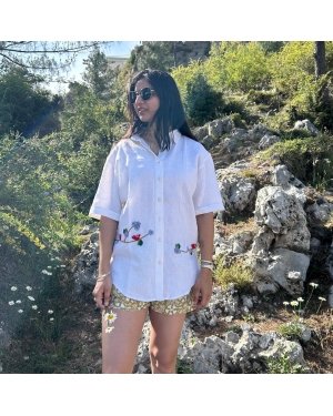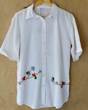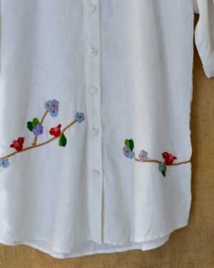 Elevate your wardrobe with the White Serene Stitch Linen Shirt, crafted from premium linen for a luxurious feel. This shirt features a front placket with crochet buttons, a classic shirt collar, and intricate crochet details including flowers, leaves, and a bird.