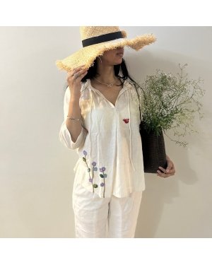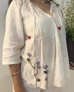 Elevate your style with the White Serene Stitch Linen Top. Crafted from premium linen, this top features a round neck with gathered details and a string for a refined touch. The 3/4th sleeves are adorned with delicate crochet details of flowers, leaves, and a bird, making it a versatile and elegant addition to your wardrobe.
