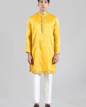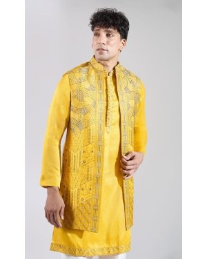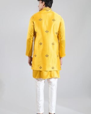 Yellow crepe silk based long open jacket enhanced with resham embroidery, paired with a matching kurta and an off white dupion silk based pants.