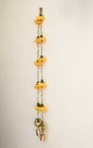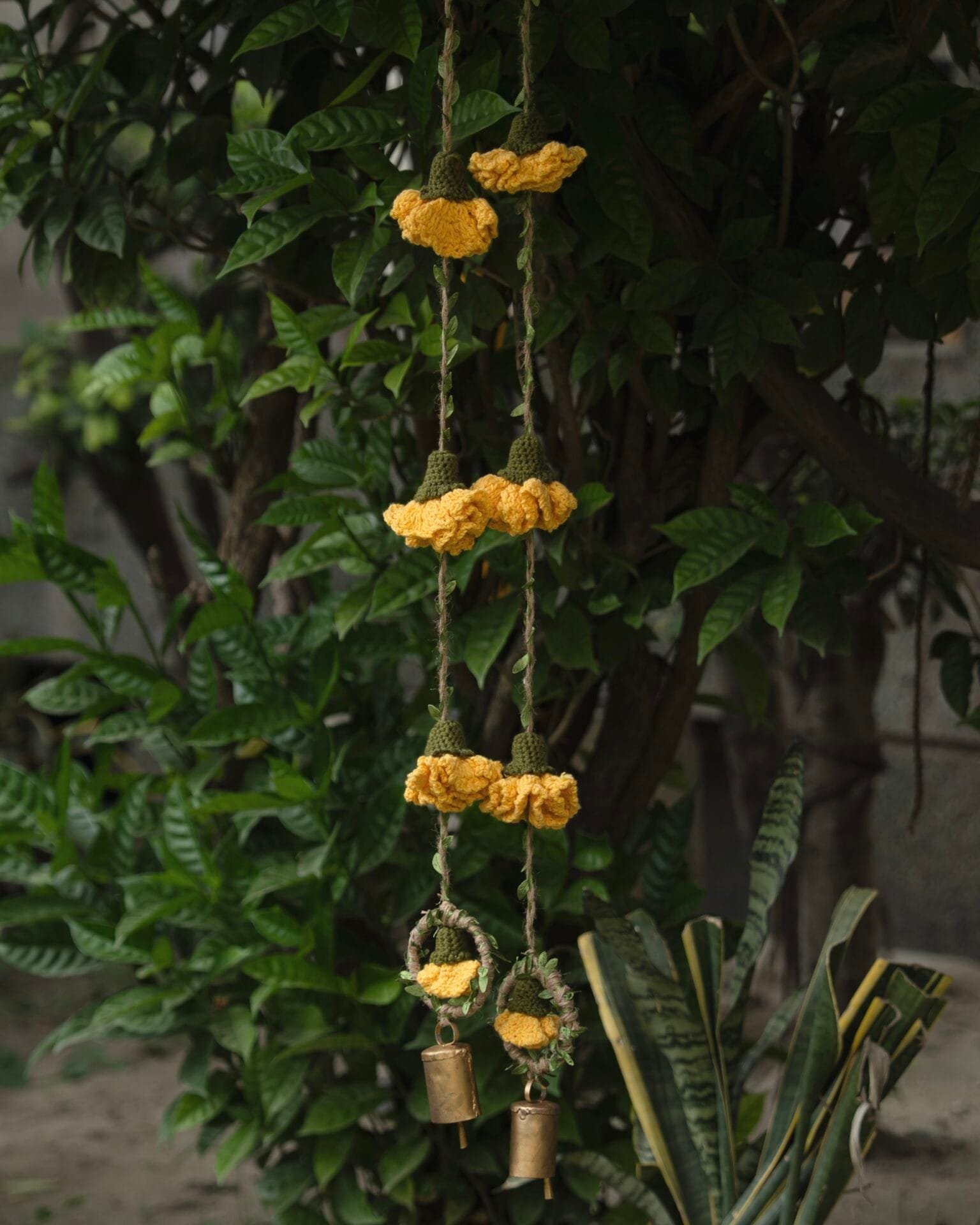 Celebrate the season of lights with handmade beauty that lasts beyond the festivities. This decor hanging brings together crochet marigold flowers on sturdy jute yarn, finished with a brass bell that adds a gentle, traditional chime. A loop at the top makes it easy to hang on doors, walls, or windows, filling your home with festive warmth and charm.