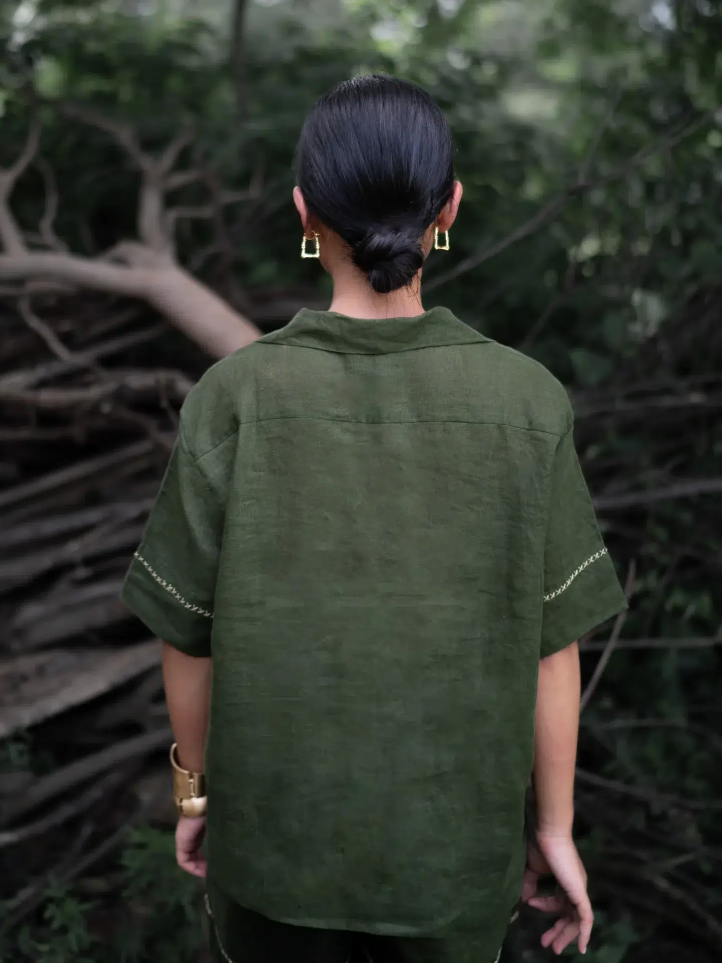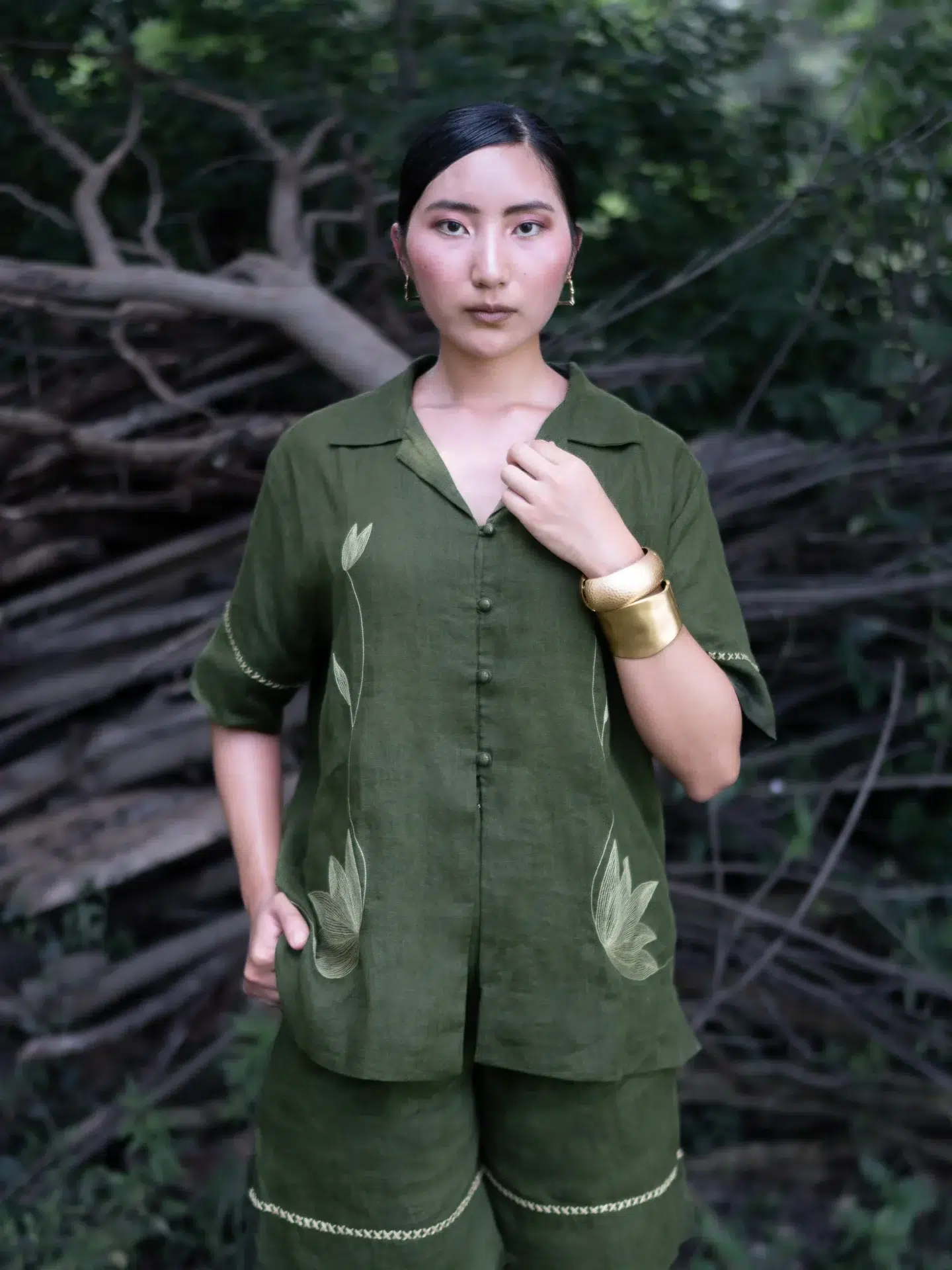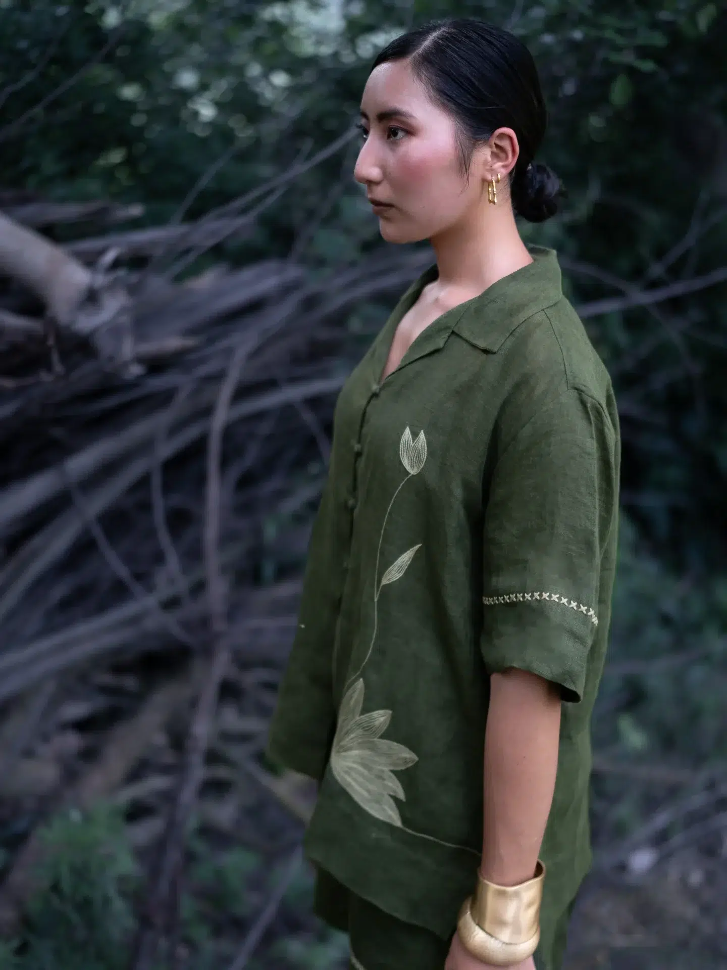 Crafted from breathable linen, this top features an oversized fit with a relaxed drop shoulder and a refined notch collar neckline. Delicate hand-embroidered line art motifs add an artisanal touch, making it a versatile piece that pairs effortlessly with both tailored bottoms and casual separates.